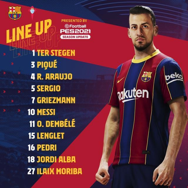 巴萨首发:1-特尔施特根/4-阿劳霍、3-皮克、15-朗格莱、18-阿尔瓦/27-莫里巴、5-布斯克茨、16-佩德里/11-登贝莱、10-梅西、7-格列兹曼